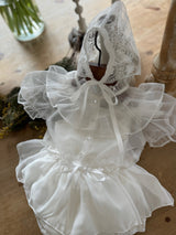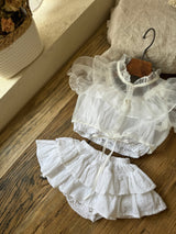A romantic baby cardigan in elegant chiffon lace, perfect for a refined look. The ruffles along the front and sleeve cuffs add a sweet touch, and it can be worn buttoned up as a blouse. Available in two colors, this cardigan adds a touch of elegance to any outfit.