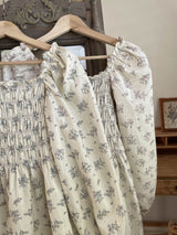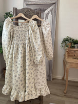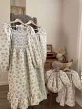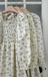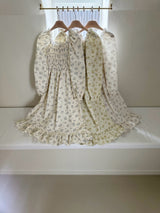 This dress features a luxurious smocked design and delicate floral patterns, exuding both elegance and charm. The puff sleeves and frilled skirt hem add to its feminine appeal. The smocked chest detail beautifully shapes the upper body while ensuring a comfortable fit. Flowing into a graceful A-line silhouette, this dress has a romantic and timeless feel. Perfect for both casual outings and special occasions, it effortlessly blends style, comfort, and sophistication.