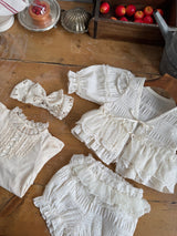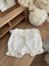 These adorable frill shorts are perfect for little ones. With their bloomers-like fullness, they look absolutely lovely when paired with a matching cardigan. The multi-layered frills at the waist add a vintage touch, making it absolutely adorable. Pairing it with matching cardigan, available separately, creates a cute, doll-like look.