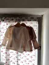 The soft, velvety texture brings a touch of elegance, while the frill detailing along the neckline and voluminous puff sleeves add a youthful, feminine flair.