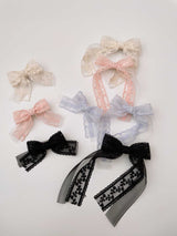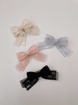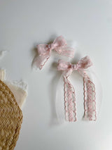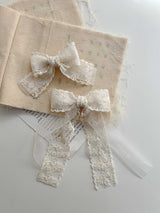 A beautifully layered ribbon clip featuring delicate rose-embroidered lace and soft cream organza tape.