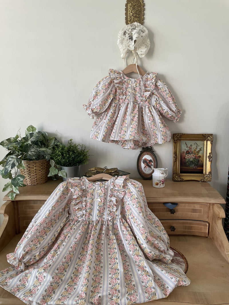 This lovely dress features a captivating vintage floral wallpaper print that brings timeless charm. The frill accents along the chest and petite ribbon details add a playful and delicate touch.