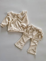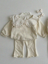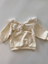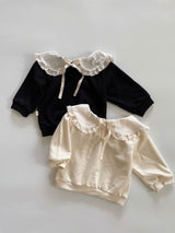 This adorable sweatshirt features a wide, rounded collar as its signature detail. The delicate lace trim along the collar adds a charming touch. Perfect for pairing with skirts, jeans, or leggings, it effortlessly creates a sweet and stylish look! You can wear it with the ribbon in the front or the back!