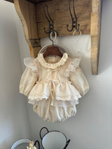 A delicate vest made from elegant organza with lace frill accents — perfectly tailored for little ones. The shoulder frills and layered ruffles cascading from the waist create an angelic silhouette, reminiscent of tiny wings. Featuring a sweet ribbon tie and layers of airy frills trimmed with eyelet-embroidered cotton, this piece adds a touch of dreamy charm to any outfit.