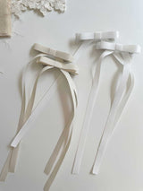 This is a bow clip set made with a luxurious grosgrain ribbon in a long, elegant tail. It looks really beautiful when pinned on both sides of hair that reaches shoulder length, and it also adds a lovely touch as a hair accessory for those with short hair.