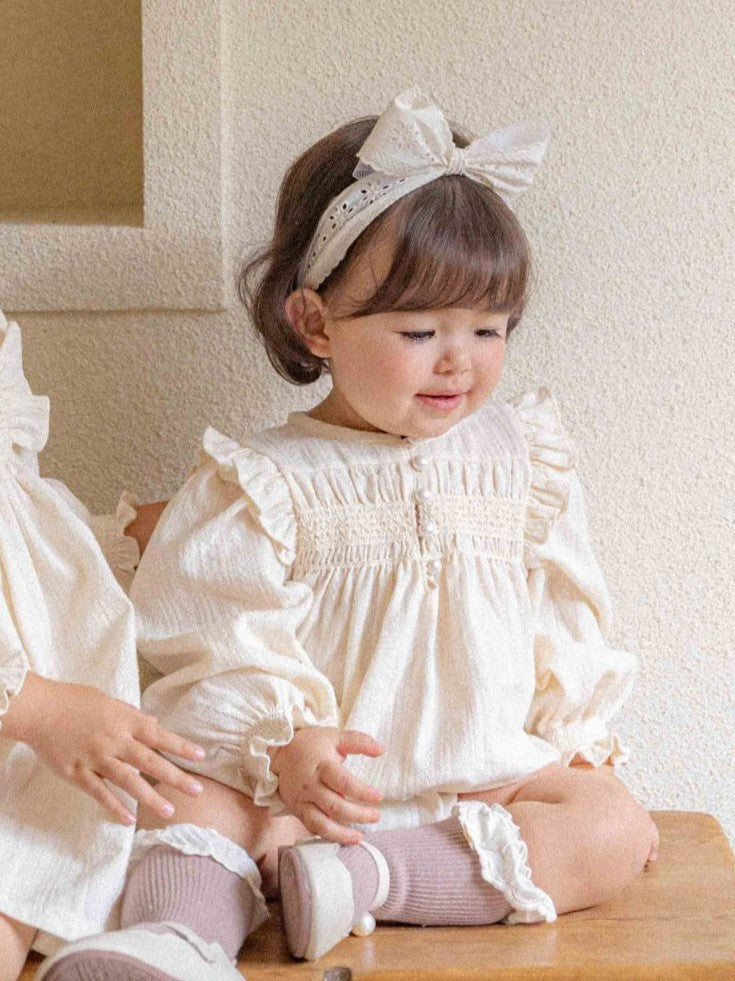 A luxurious cream baby romper crafted from soft and delicate jacquard cotton, capturing timeless vintage elegance.
