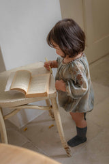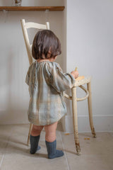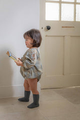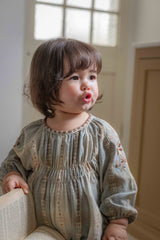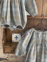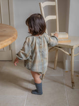 • Baby romper crafted in vintage-inspired gradient check fabric with delicate floral embroidery