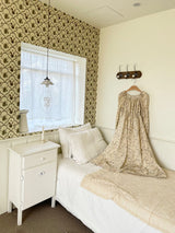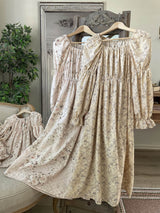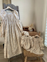 Crafted from luxurious eyelet cotton with delicate floral embroidery throughout, this dress exudes timeless elegance. The high-waisted design features soft gathering at the chest, creating a flattering and graceful silhouette, while the tiered shirring adds volume to the romantic puff sleeves. A lace ribbon detail on the cuffs enhances its charming appeal.