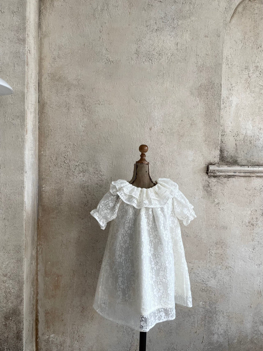 A soft lace dress featuring a beautifully layered frill neckline and gently puffed sleeves for a romantic, vintage-inspired look.
