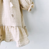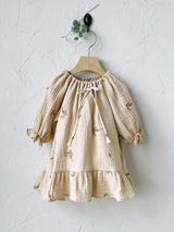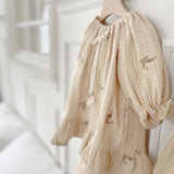 This adorable dress is made from soft muslin cotton and features delicate all-over embroidery. The voluminus shape and intricate embroidery add to its charm, while the smocked chest detail and ribbon tie make it even more delightful.