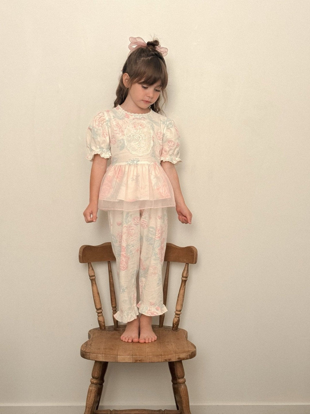 With its vintage floral print, puff sleeves, and delicate lace details, this set captures a graceful and charming look.