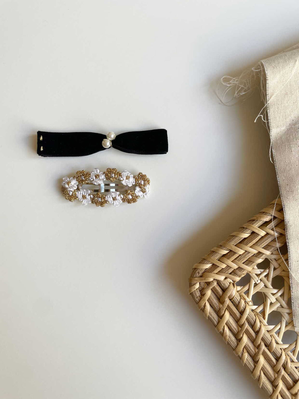 It's a set of romantic velvet clips adorned with pearl embellishments and adorable pearl flower chain clips. This clip set is curated for special occasions, making it perfect for wearing each piece separately.