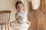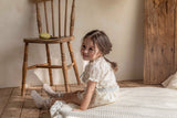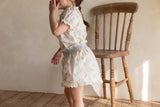 Embroidered lace trim on blouse neckline, sleeves, and shorts hem
